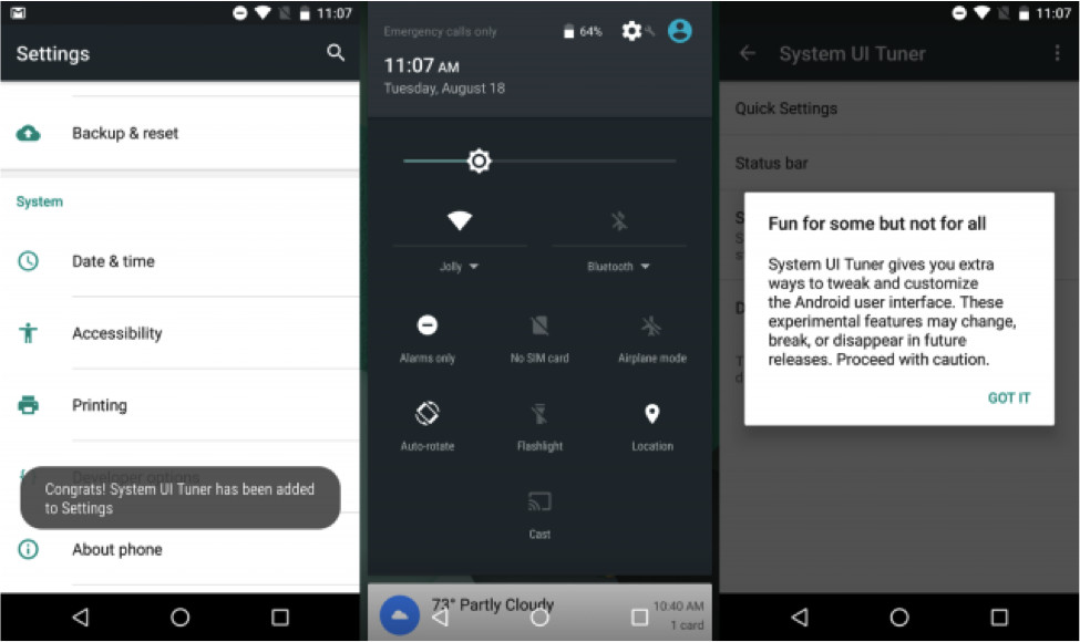3) Уберите палец и всплывающее уведомление сообщит Вам, что System UI Tuner добавлен