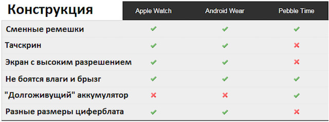 Таблица 1: сравнение конструкции «умных часов» Watch, Pebble Time и Android