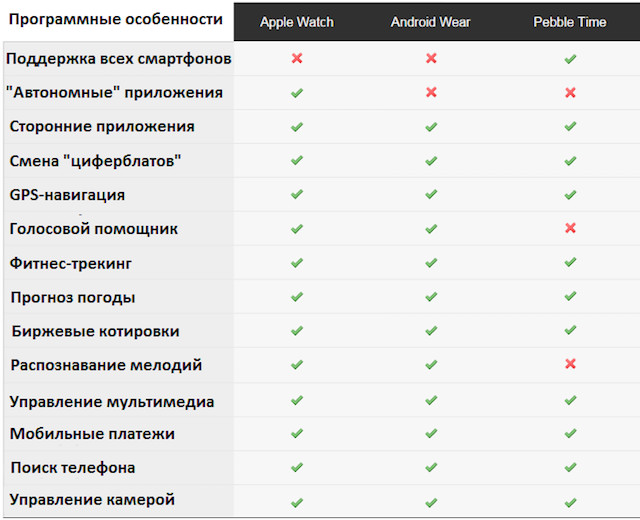 Таблица 2: сравнение Apple Watch, Android Wear и Pebble Time с программной точки зрения