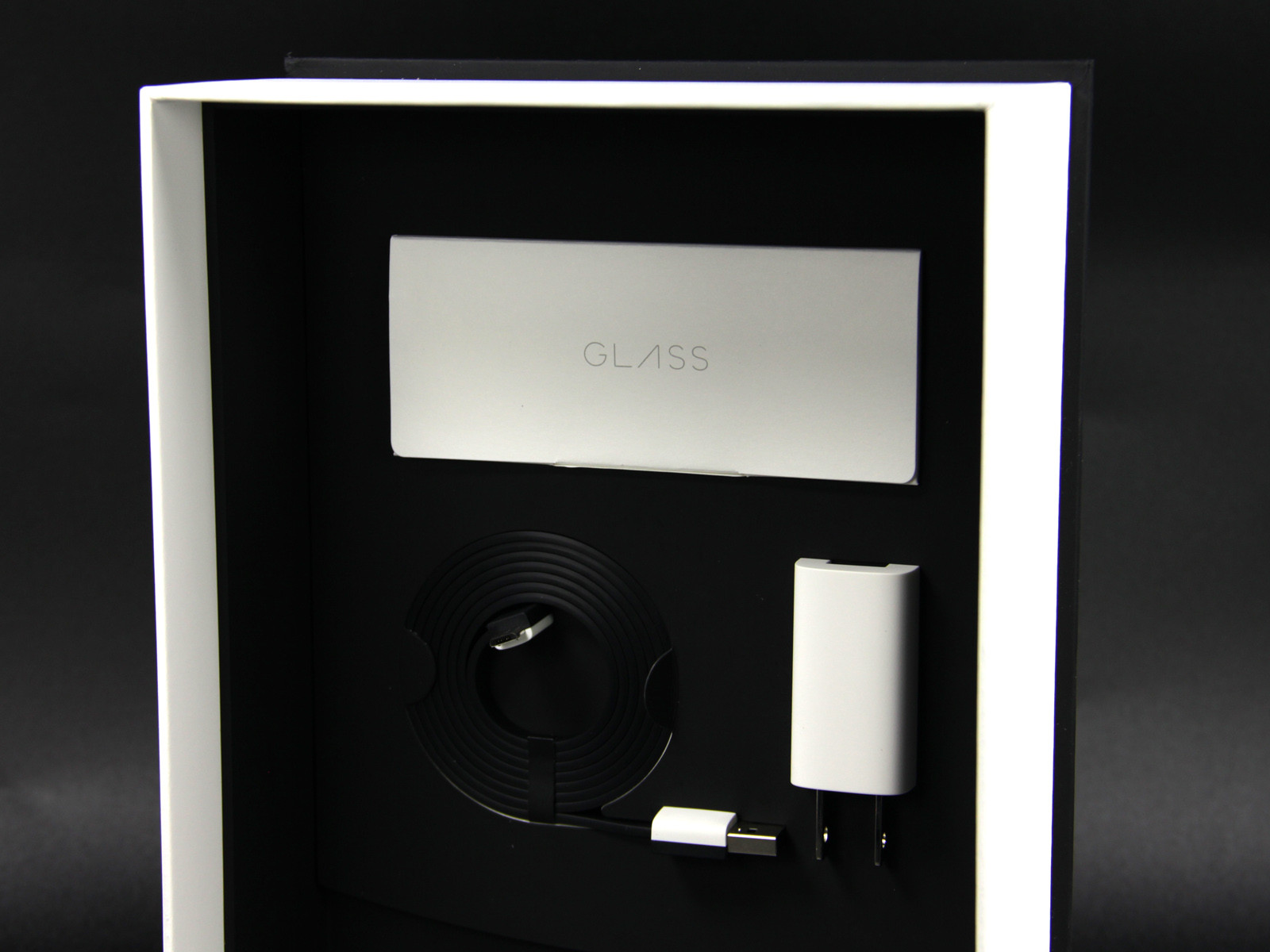 Очки Google Glass поставляются в большой подарочной упаковке из добротного белоснежного картона. Словно коллекционное издание книги, гаджет заботливо уложили в массивный бокс, дополнив процесс распаковки рядом небольших ритуалов. Сперва придётся отклеить верхний упаковочный слой из полупрозрачной бумаги, а затем можно будет изучить в деталях очки и рассмотреть поясняющие надписи ко всем клавишам.