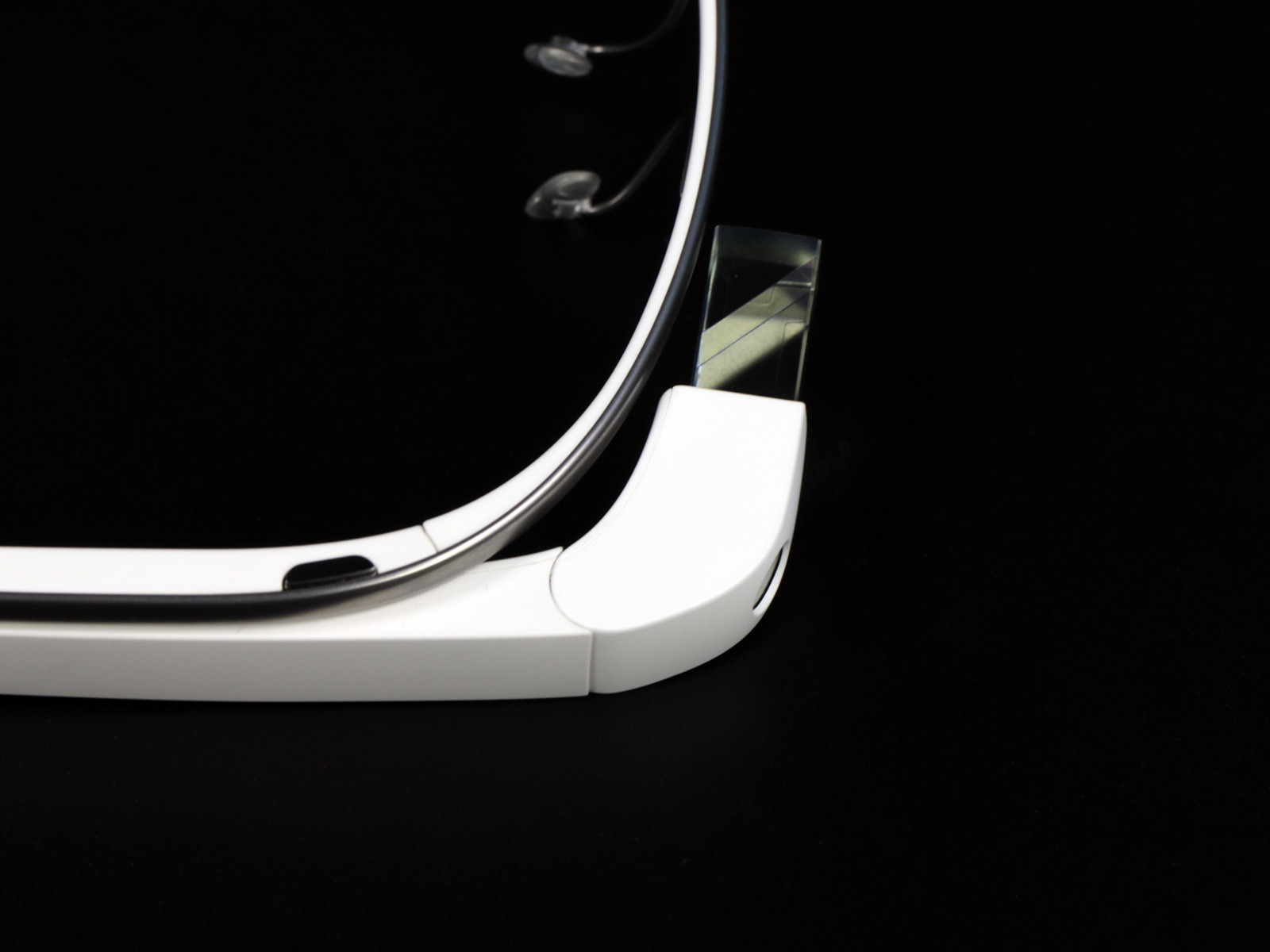 Видите массивный выступающий блок с гранённым стеклянным кубом? Это глаза и руки Google Glass, а также монитор взаимодействия с пользователем в одном флаконе. Формально в Google не сделали ничего нового: взяли крошечный проекционный монитор из фотокамер с разрешением 640 x 360 точек и установили его на хитрой формы гранённую призму, внутри которой под углом проходит отражающий слой. Вот этот слой и располагается к глазу под углом, словно тут повесили прозрачный экран. Блок обладает небольшой свободой регулировок, позволяющей чуть приблизить, или отдалить монитор от сетчатки глаза.