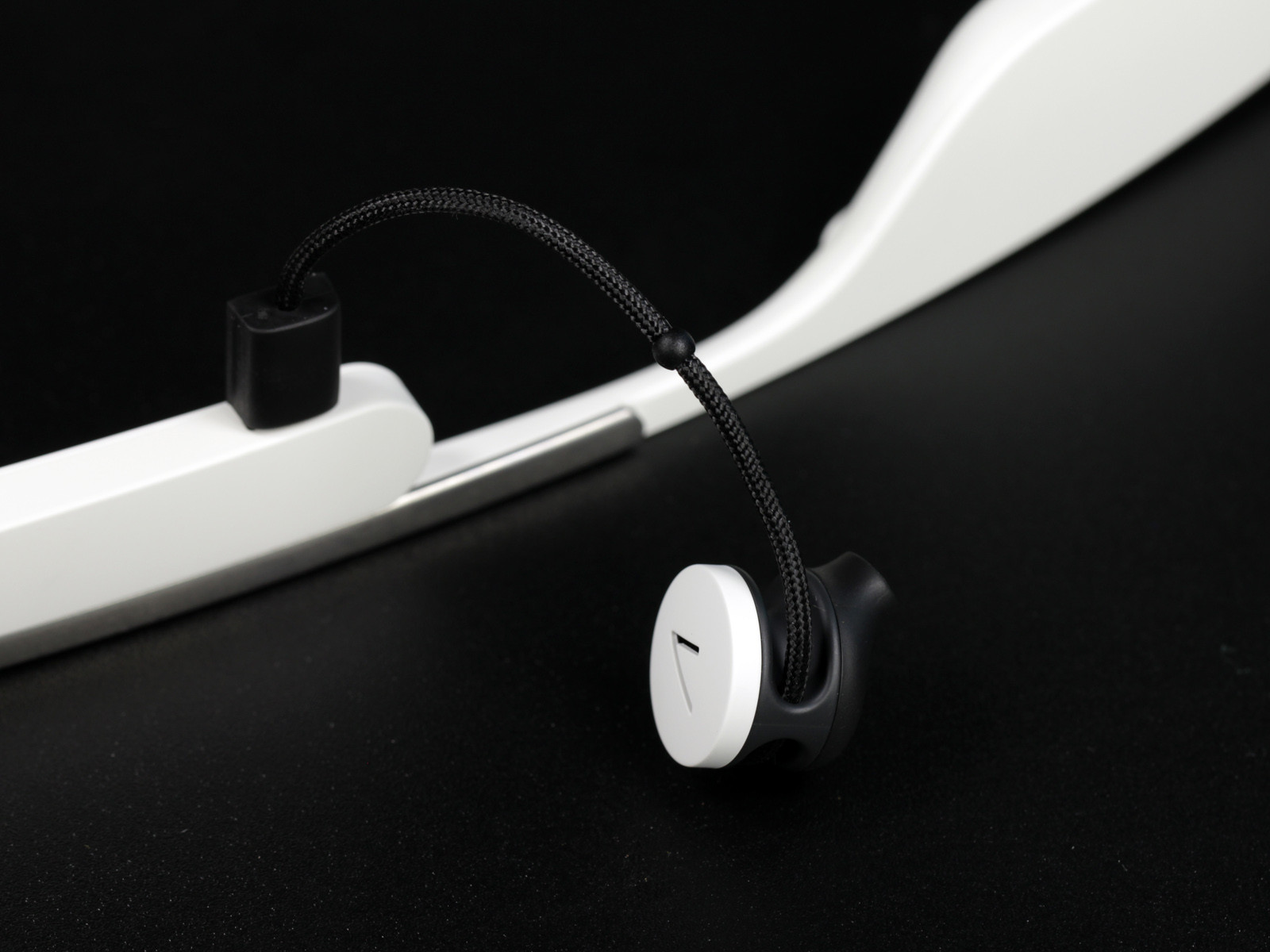 Далее начинается второй управляющий блок, состоящий из всех электронных компонентов Google Glass под одним тонким корпусом. Ближе к уху располагается клавиша управления, а основным элементом перемещения по меню является сенсорная область с внешней стороны. Ставшие классикой взмахивания, пролистывания и другие интуитивные жесты тут задействуются в полной мере.