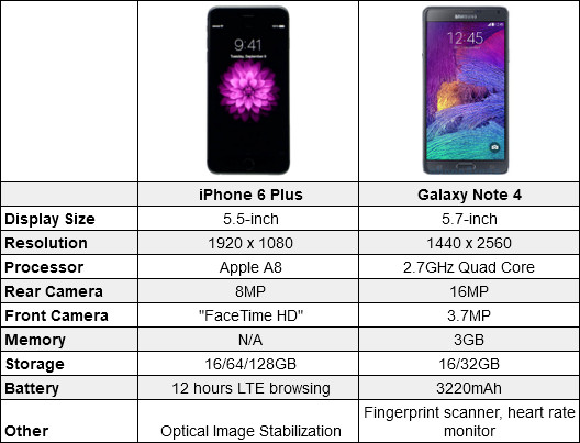 Как видим из видео-сравнения и таблицы Galaxy Note 4 имеет большую диагональ и лучшую камеру, однако проигрывает iPhone 6 Plus по мощности и объему внутренней памяти.