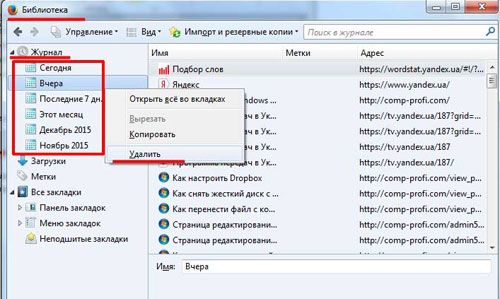 Некоторых пользователей также интересует, как открыть историю в Мозиле с целью просмотра событий и частичного их удаления. Для этого необходимо в панели меню браузера выбрать вкладку «Журнал» и в появившемся списке подменю нажать на «Показать весь журнал». Откроется окно «Библиотека» со списком посещенных ресурсов. Наведя курсор на конкретный сайт и кликнув по нему правой кнопкой мышки, можно удалить его из истории, выбрав пункт меню «Удалить эту страницу». Таким же способом можно удалить все записи, принадлежащие конкретной категории, расположенные в левой колонке окна.