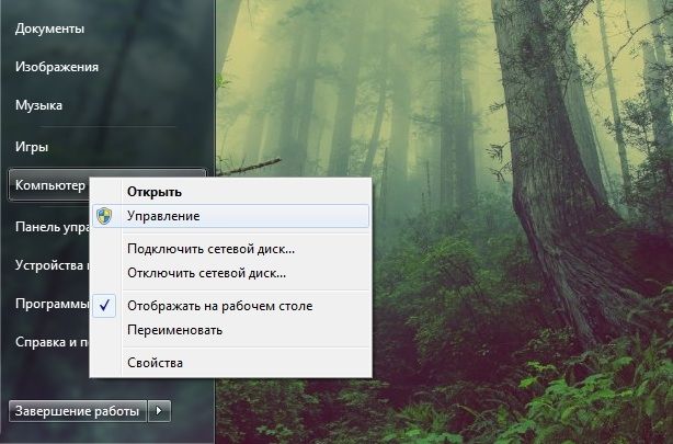 - нажать Пуск, далее ПКМ на Компьютер —> Управление.