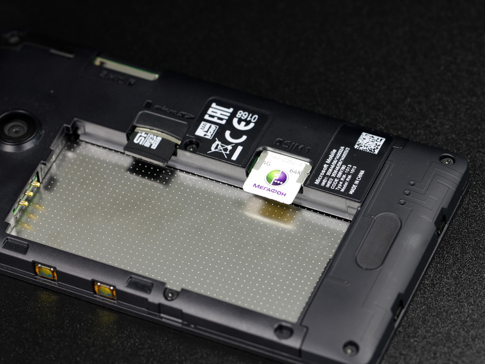 Внутри мы видим классическое размещение элементов. По левому борту проходят слоты для двух SIM-карт, плюс отсек для карточки памяти microSDHC.