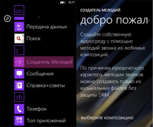 Необходимо открыть «Создатель мелодий», нажать на «выбрать композицию» в нижней части экрана, и выбрать песню, которую вы хотите использовать как рингтон.