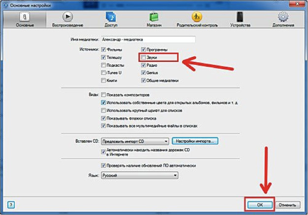 Если его у вас нет, то просто берем и заходим в раздел «Настройки» программы iTunes, а затем ставим галочку напротив графы «Звуки»