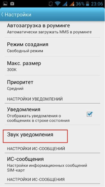 Если необходимо изменить сигнал уведомления о приходе нового сообщения, то сделать это можно в штатном приложении для работы с SMS. Запустите стандартную программу «SMS/MMS» и откройте её настройки. Здесь необходимо промотать окно почти в самый низ и найти пункт «Звук уведомления». Его нажатие вызовет уже знакомое окно выбора мелодии.