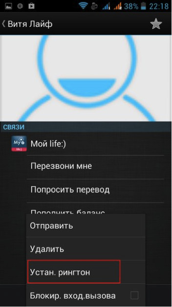 Если пользователю необходимо установить новую мелодию на вызов от определённого контакта, то можно использовать для этого адресную книгу телефона. Найдите в общем списке необходимый контакт и откройте связанную с ним детальную информацию. После этого коснитесь кнопки контекстного меню и выберите пункт «Установить рингтон». Обратите внимание, что этот способ работает только в том случае, если контакт хранится в памяти телефона, а не на
