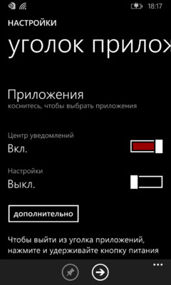 Из еще более очевидных нововведений - уголок приложений, предоставляющий возможность ограничить доступ к некоторым приложениям, да и вообще установить дополнительный пароль на доступ к системе.